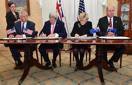 Về phía phái đoàn Mỹ có Ngoại trưởng John Kerry và Bộ trưởng Quốc phòng Chuck Hagel. Hai bên đã ký kết thỏa thuận có thời hạn 25 năm cho phép Mỹ triển khai luân phiên 2.500 lính thủy đánh bộ Mỹ và không quân đến miền Bắc Úc.