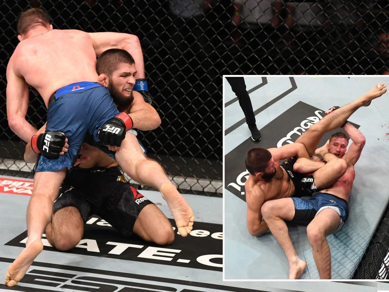 Cứ mỗi khi Gaethje ra đòn tay thì hở sườn và thế là Khabib nhanh như điện phản đòn đánh vào những vùng cực kỳ nguy hiểm như quai hàm, cổ. Mỗi khi Gaethje tung đòn chân thì Kahbib lại lao vào bắt “bộ ngựa” để vật đối thủ xuống sàn rồi đưa “con mồi” vào thế cho đòn siết sở trường như những cú siết của trăn Nam Mỹ.