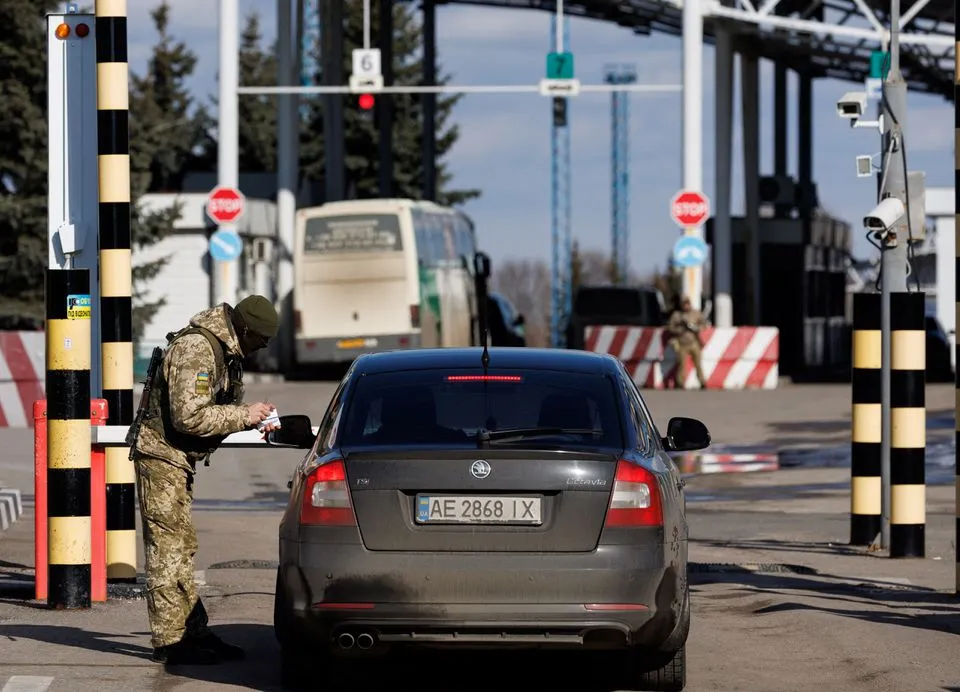 Một lính gác biên phòng Ukraine kiểm tra giấy tờ của một người đàn ông tại TP Kharkiv, miền đông nước này, vào ngày 23-2. Ảnh: REUTERS