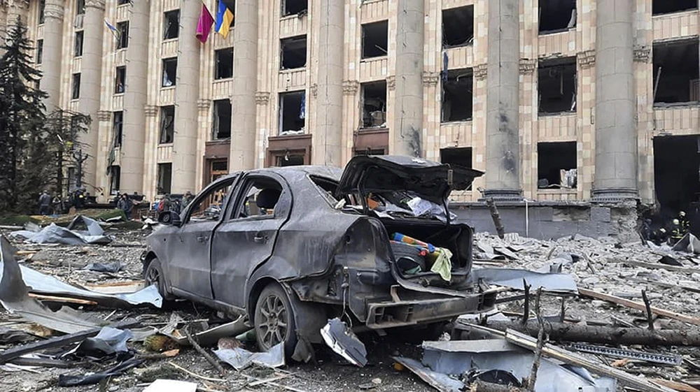 Một chiếc xe hơi bị phá huỷ trước Hội trường thành phố, Kharkiv, Ukraine do chiến dịch quân sự đặc biệt của Nga. Ảnh: AP