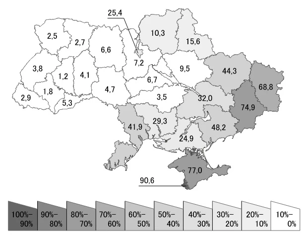 Bản đồ phần trăm dân số nói tiếng Nga theo từng vùng của Ukraine (Ảnh: Website Ukrainian Census)