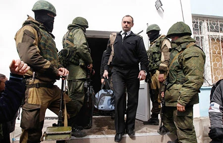 Một sĩ quan Ukraine rời bộ chỉ huy hải quân ở Sevastopol sáng 19-3. Ảnh: AP