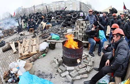 Chướng ngại vật trước trụ sở cảnh sát ở Donetsk (miền Đông). Ảnh: GETTY IMAGES