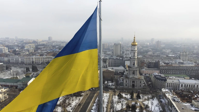 Quốc kỳ Ukraine ở trung tâm Kharkiv - thành phố lớn thứ hai của nước này. Ảnh: AP