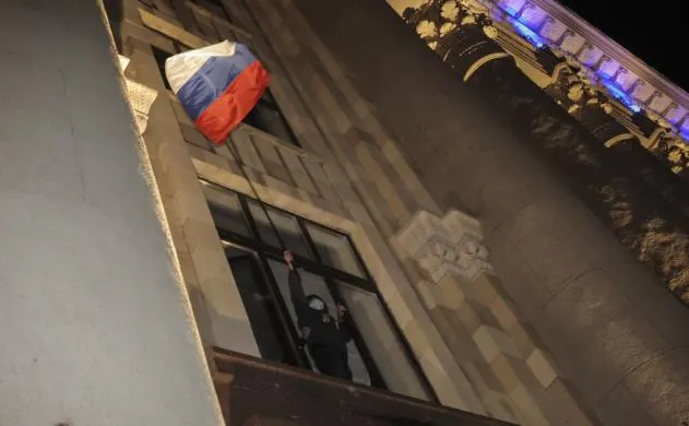Một người biểu tình vẫy cờ Nga trên cửa sổ tòa nhà cao tầng. Ảnh: Reuter