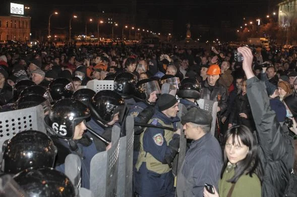 Người biểu tình xông vào tòa nhà chính phủ tại khu trung tâm công nghiệp Donetsk và văn phòng bảo vệ an ninh ở gần Luhansk. Họ phất cờ nga và đòi hỏi một cuộc trưng cầu dân ý kiểu Crimea đã làm trước đó. Một số người biểu tình bị bắt giữ tại tòa nhà ở Kharkiv, thành phố lớn thứ hai của Ukraine. Tất cả những thành phố xảy ra tình trạng căng thẳng đều nằm gần biên giới giữa Nga và Ukraine.
