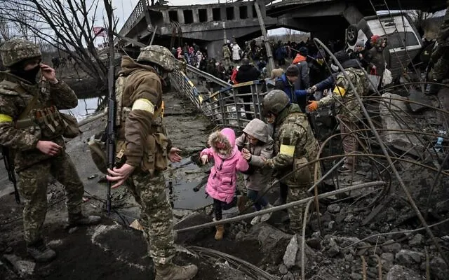 Quân đội Ukraine sơ tán người dân khỏi khu vực bị sập ở thành phố Irpin, tỉnh Kiev. Ảnh: AFP