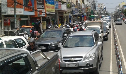 Xe cộ ùn tắc kéo dài hàng trăm mét trên đường Bạch Đằng - Ảnh Phước Tĩnh