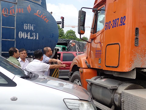 Một vụ va chạm, cãi vã giữa tài xế xe container và các tài xế xe du lịch ở ngã ba Đồng Văn Cống - Mai Chí Thọ ngày 13-7. Ảnh: LĐ