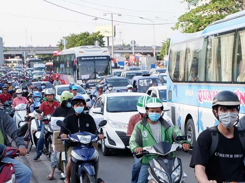 Theo ghi nhận của PV Pháp Luật TP.HCM, tại Bến xe Miền Đông, lượng khách đổ về tăng mạnh khiến khu vực mua vé trở nên quá tải. Từ ngã tư Hàng Xanh theo đường Xô Viết Nghệ Tĩnh đổ về Bến xe Miền Đông, dòng người, xe phải nhích từng chút một.