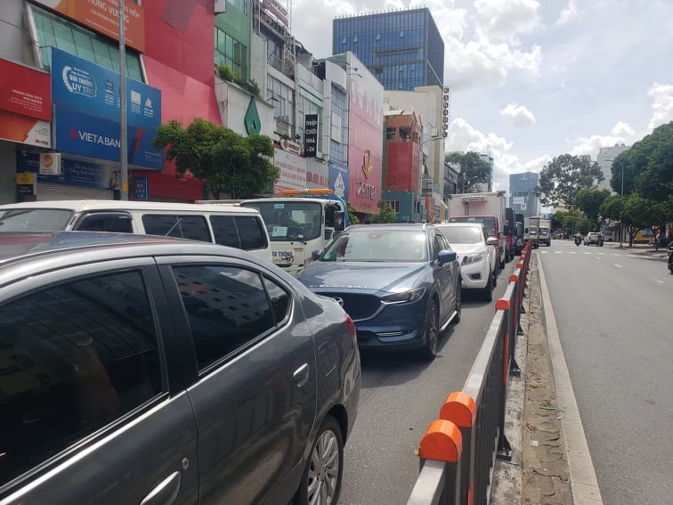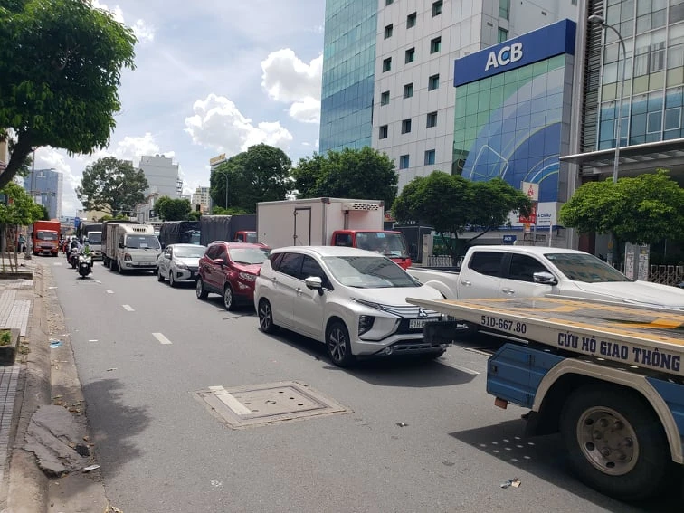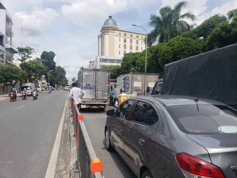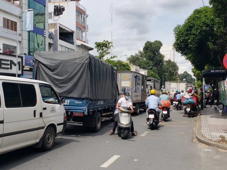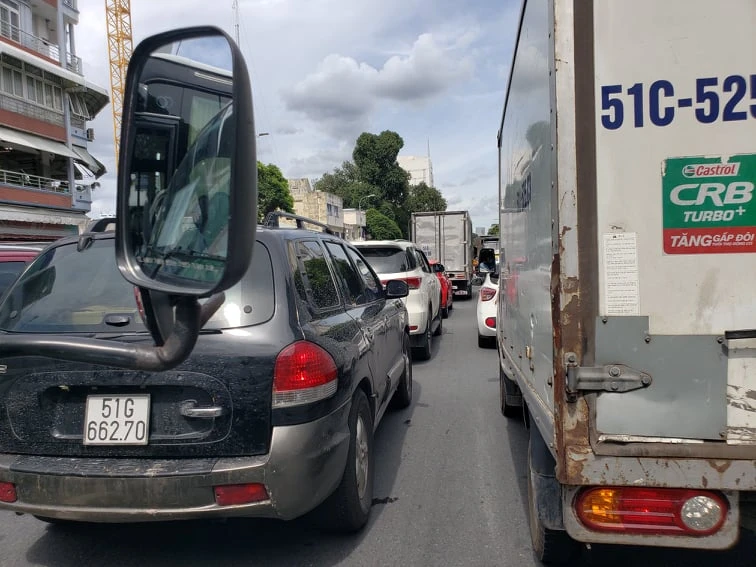 Quan sát cho thấy, các phương tiện ô tô, xe máy nối đuôi nhau kéo dài khoảng 1km theo hướng từ sân bay Tân Sơn Nhất về ngã tư Hàng Xanh. Nhiều xe tải còn lấn sang đường ngược chiều để di chuyển.