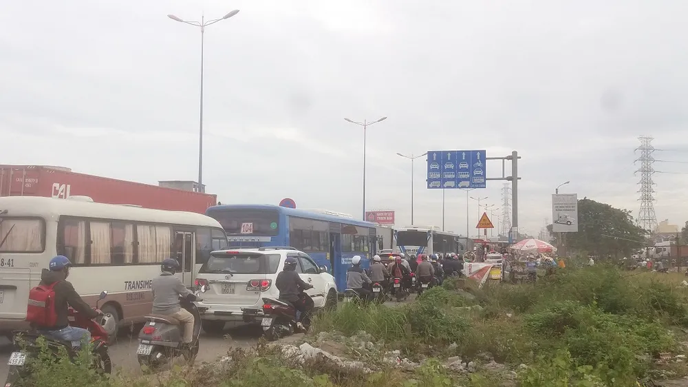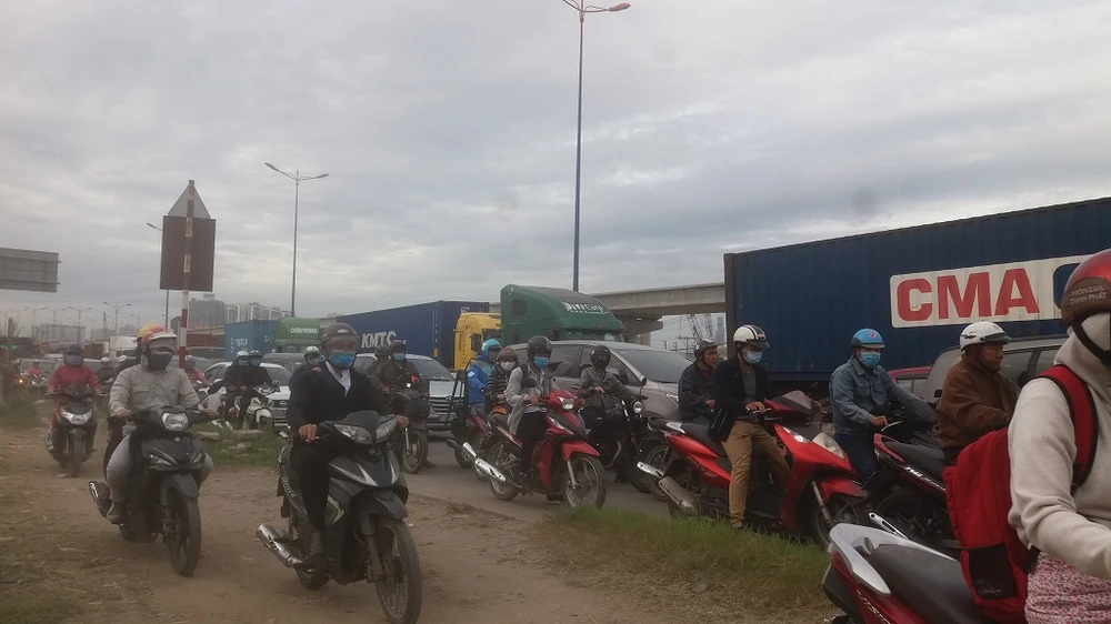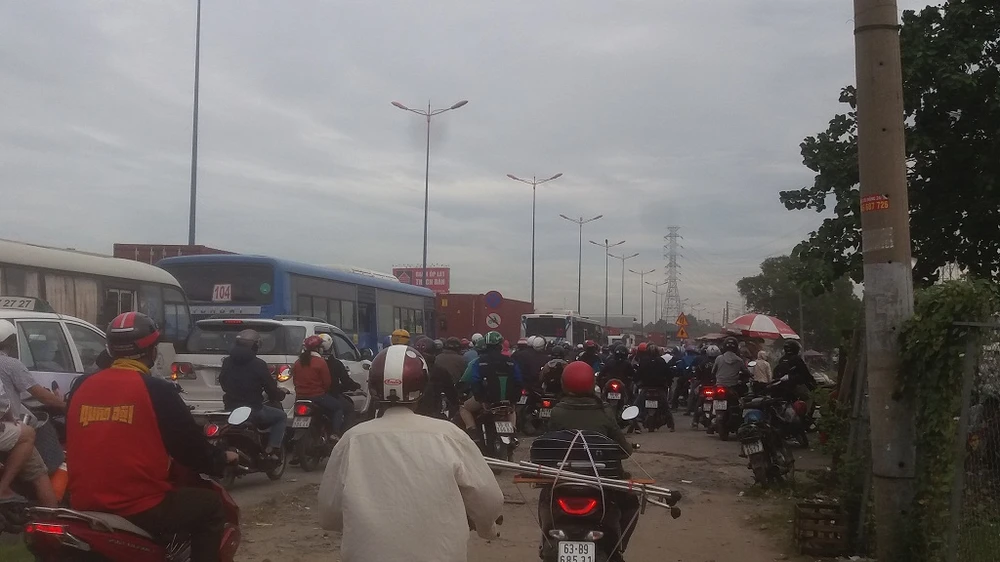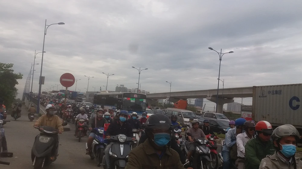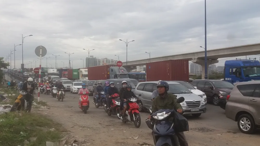 Nhiều phương tiện bị ùn ứ, di chuyển khó nhọc đoạn từ cầu Rạch Chiếc đi về hướng Thủ Đức. Ảnh: THANH TUYỀN