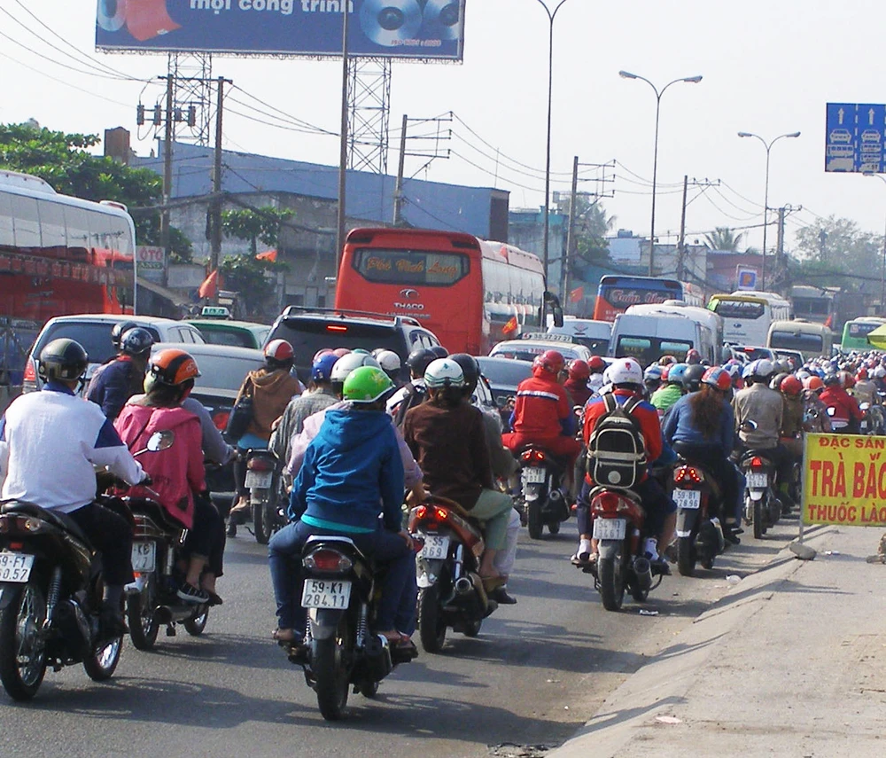 Xe cộ lớn nhỏ dày đặt trên cầu Bình Điền vào sáng mùng một tết. Ảnh: TRẦN NGỌC