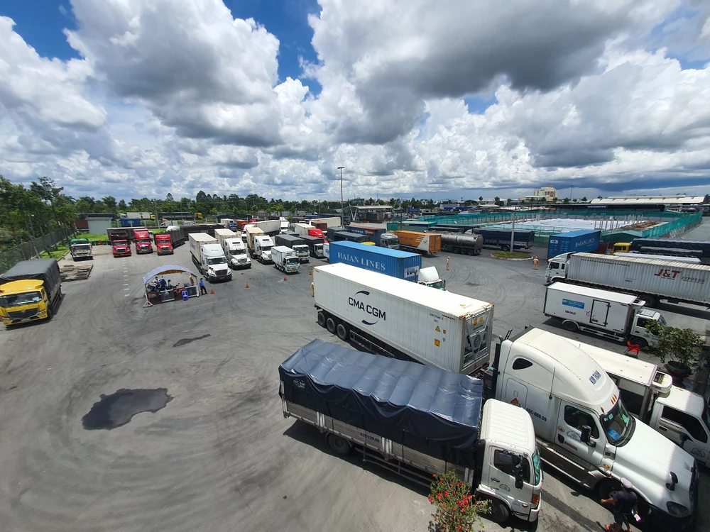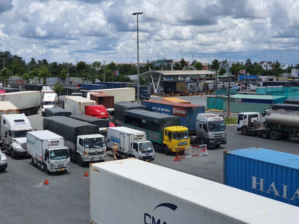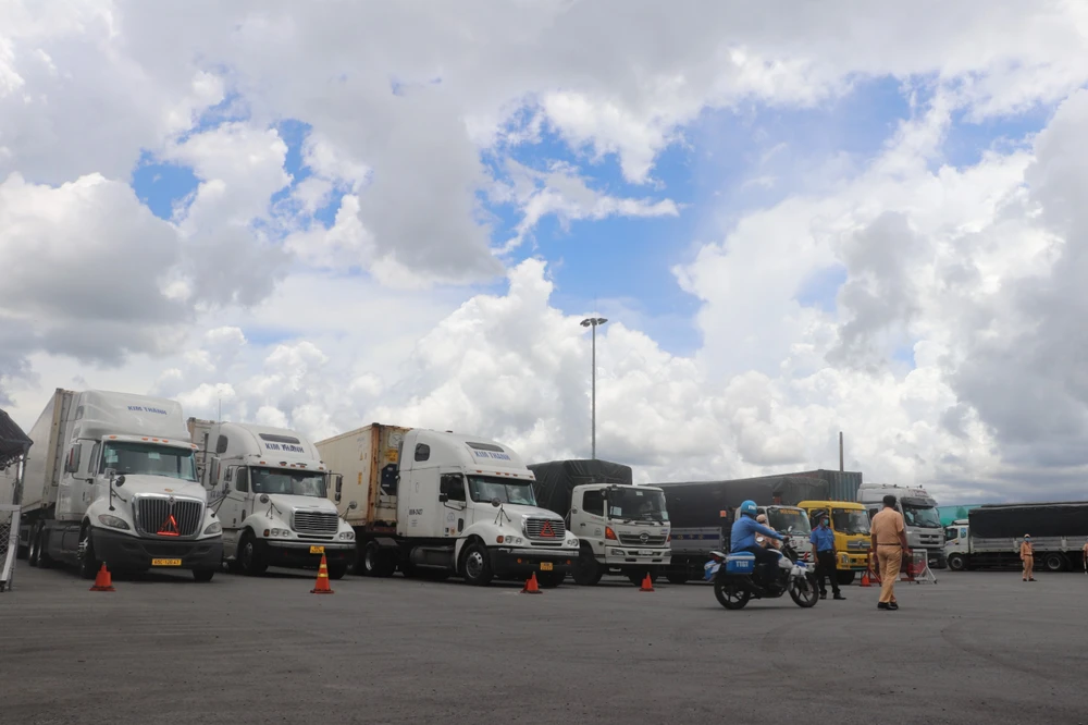 Tránh ùn ứ, lực lượng ở chốt kiểm soát điều các phương tiện vào khu tập kết hàng hóa chờ giải quyết. Ảnh: CHÂU ANH