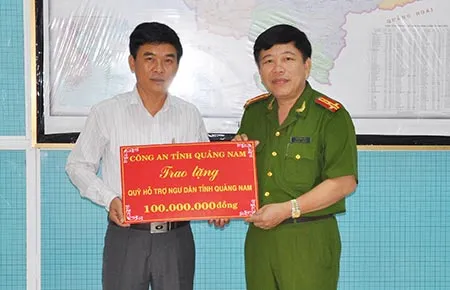 Đại tá Phan Ngọc Ngự - Phó Giám đốc Công an tỉnh Quảng Nam trao 100 triệu đồng cho Quỹ hỗ trợ ngư dân tỉnh Quảng Nam. Ảnh: K.THái