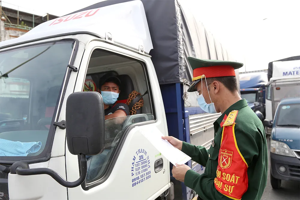 Lực lượng chức năng kiểm tra giấy tờ đối với xe chở hàng lưu thông qua chốt kiểm soát tại chân cầu Vĩnh Bình (TP Thủ Đức, TP.HCM). Ảnh: HOÀNG GIANG