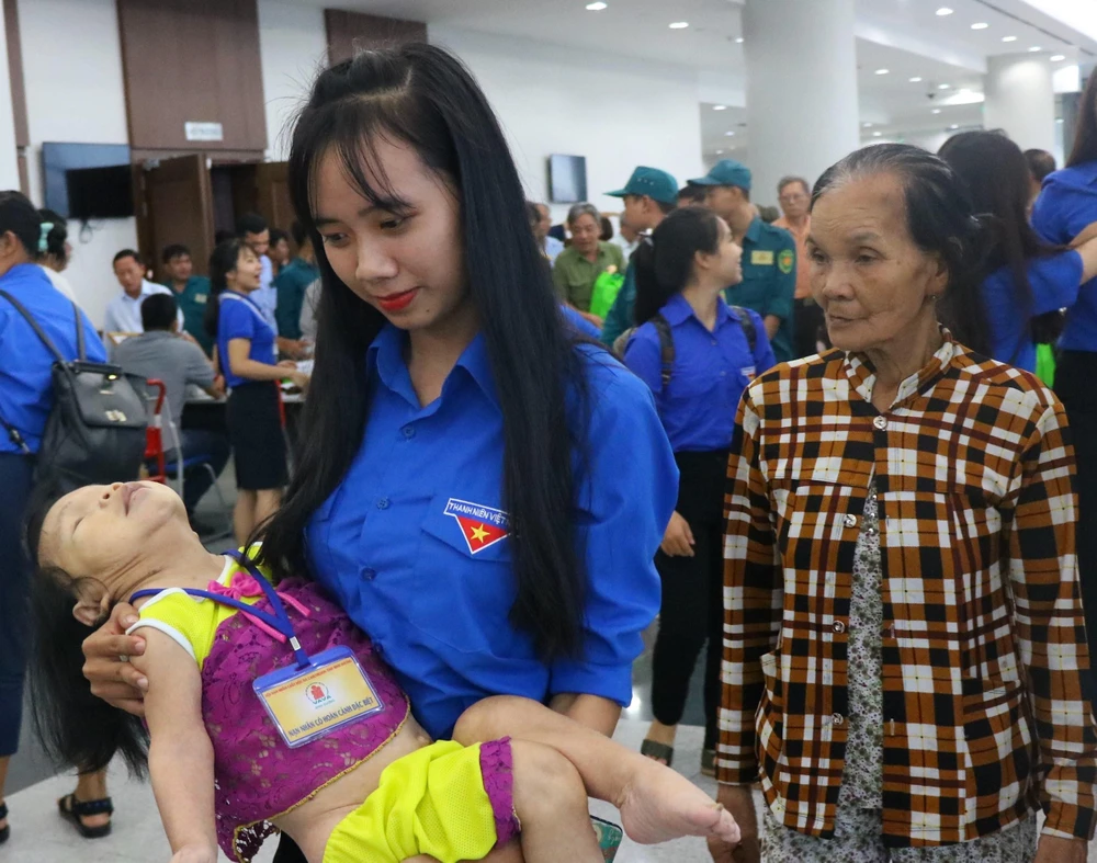 Đoàn viên thanh niên bế một nạn nhân của chất độc màu da cam tại chương trình