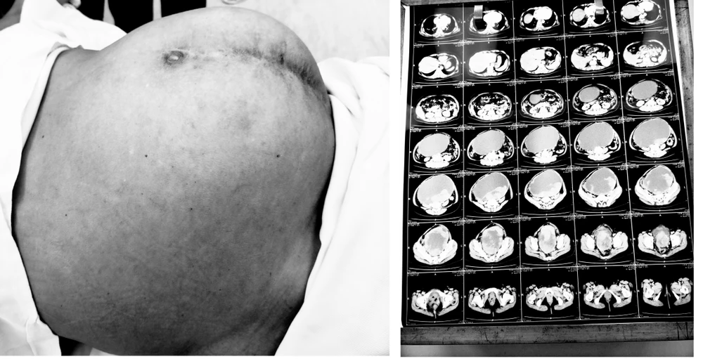Bụng của bệnh nhân to bất thường lúc nhập viện và kết quả chụp hình ảnh cho thấy khối u rất lớn. Ảnh: BVCC