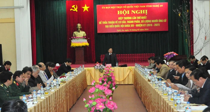 Trên cơ sở đó, Hội nghị thống nhất số lượng ứng viên đại biểu Quốc hội khóa XIV của địa phương là 35 người (5 người do Trung ương giới thiệu) và 268 người ứng cử đại biểu HĐND tỉnh Nghệ An khóa XVII. Trong 35 người ứng cử đại biểu Quốc hội khóa XIV có 23% nữ, 30% trẻ tuổi, 30% dân tộc thiểu số, 10% ngoài đảng, 6% tái cử.