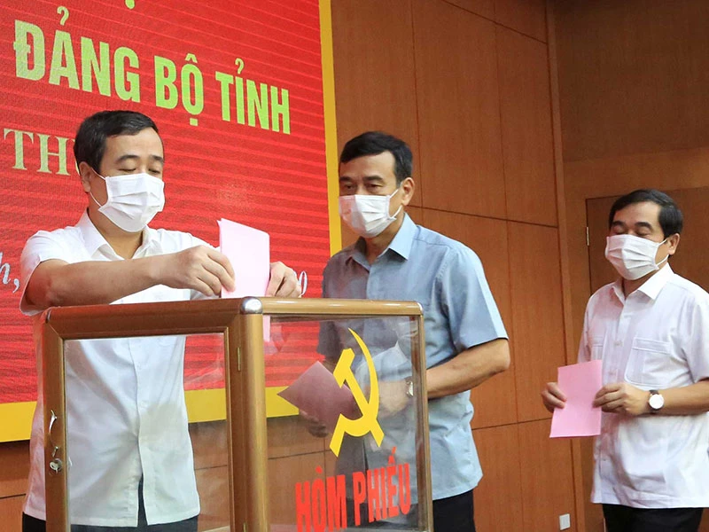 Các đại biểu đang bỏ phiếu kín tại Hội nghị thực hiện các quy trình giới thiệu nhân sự tham gia BCH Trung ương Đảng khóa XIII, được Tỉnh ủy Thái Bình tổ chức ngày 12-8. Ảnh: baothaibinh.com.vn