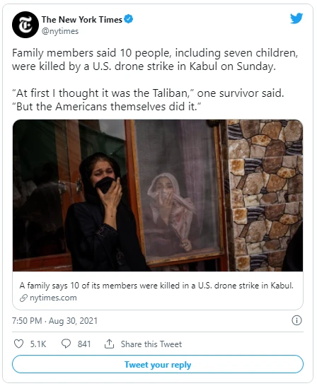 Tờ The New York Times cho biết có 10 người dân thường, bao gồm bảy trẻ em, đã thiệt mạng trong vụ không kích của Mỹ ở Kabul. Ảnh: TWITTER