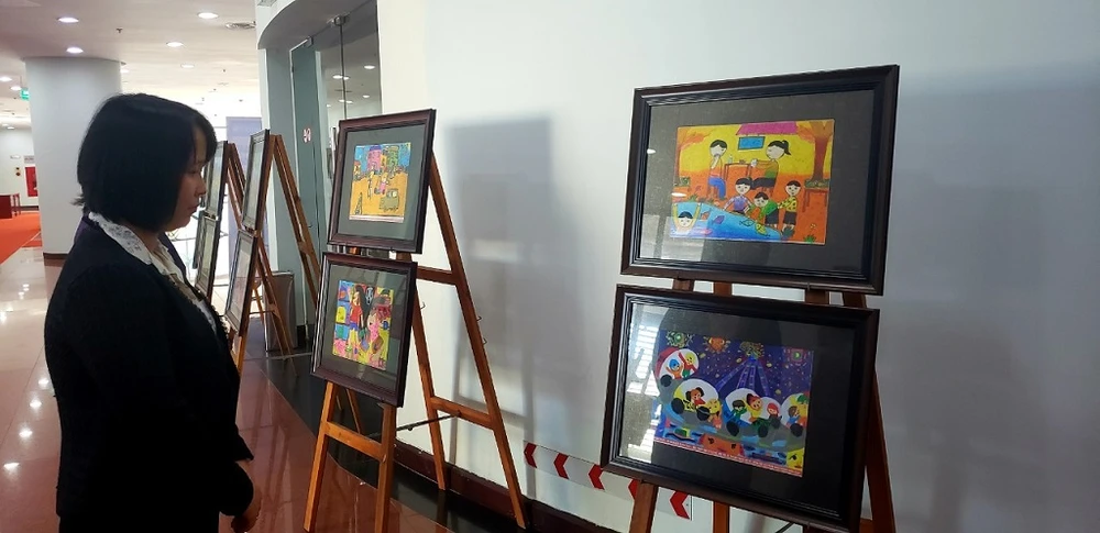 Nhiều bức tranh do các em nhỏ vẽ được trưng bày tại buổi lễ chiều nay. Ảnh: T.AN