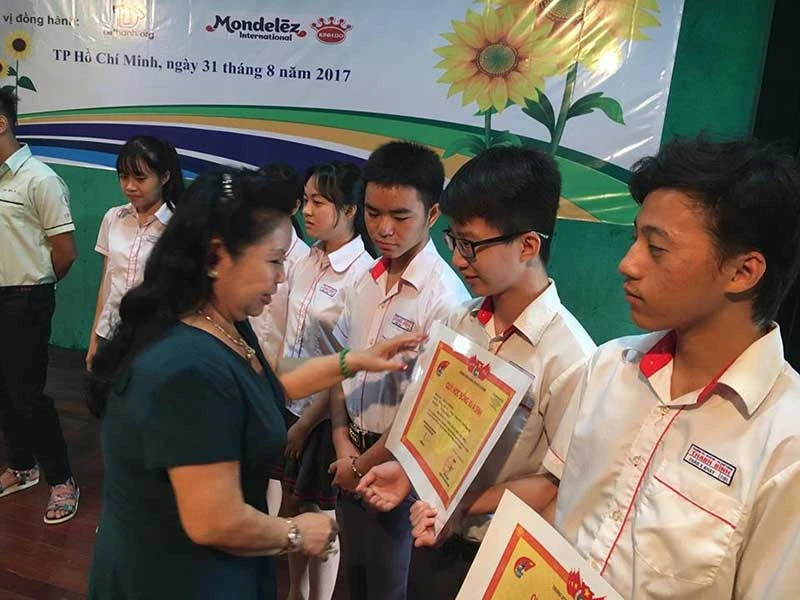Bà Nguyễn Ngọc Thu, Giám đốc nhà hàng Làng nướng Nam Bộ, trao học bổng và giấy khen cho các em học sinh của dự án đạt danh hiệu học sinh giỏi năm học 2016-2017. Ảnh: HOÀNG LAN
