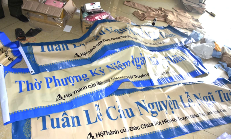 Tại đây, lực lượng chức năng phát hiện, thu giữ nhiều tài liệu, chứng cứ liên quan đến hoạt động của “Hội Thánh Đức Chúa Trời”, gồm các loại kinh thánh, quần áo, vải trùm đầu, băng rôn, khẩu hiệu, bục giảng đạo… dùng để hành lễ tuyên truyền đạo cùng các loại nước màu, bột trắng dùng làm nước thánh cho những người tham gia uống…