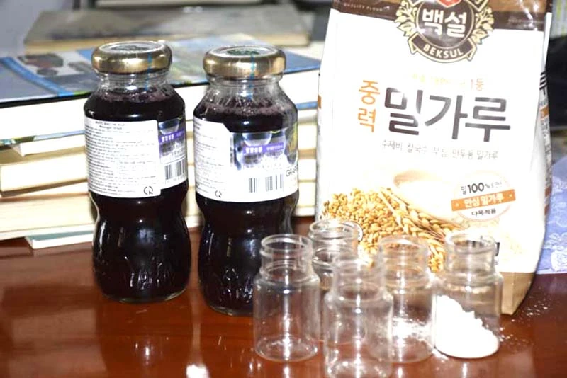 Lọ nước màu đỏ, bột màu dùng để cho các hội viên uống khi gia nhập "Hội Thánh Đức Chúa Trời".