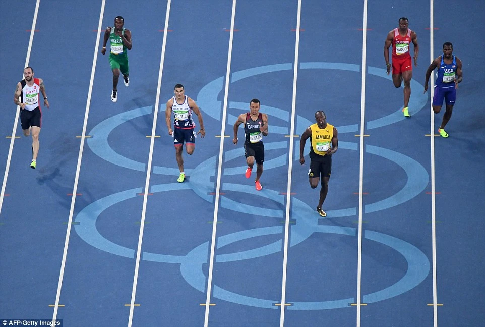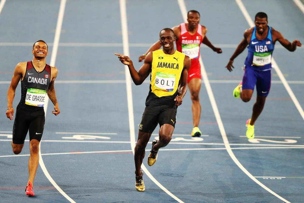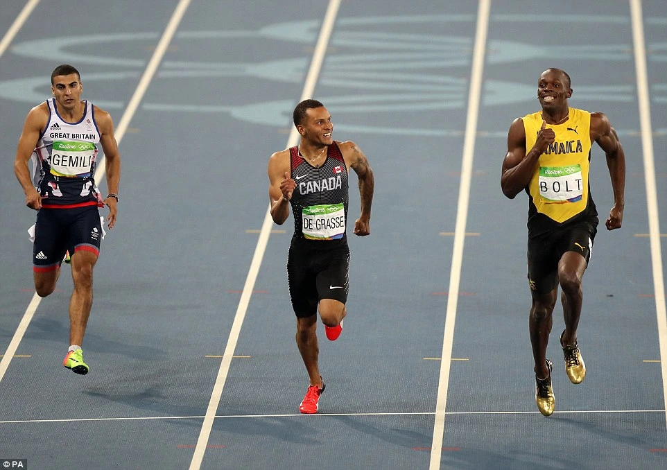 Trong lượt chạy bán kết, Usain Bolt và VĐV người Canada, Andre De Grasse đã tạo nên hình ảnh vô cùng thú vị. Ở 50 m cuối, khi Bolt tung nước rút để về đích thì De Grasse cũng tăng hết tốc lực. Cả hai vừa nhìn nhau cười vừa chạy về đích.