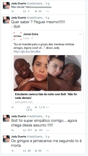 Jady Duarte đã chia sẻ hình ảnh trên WhatsApp với một nhóm bạn gái để khoe “chiến tích” của mình. Nội dung những bức ảnh cho thấy cô mặc một chiếc áo thun lót tròng đầu màu trắng và đang được ôm bởi Bolt trong tình trạng cởi trần.