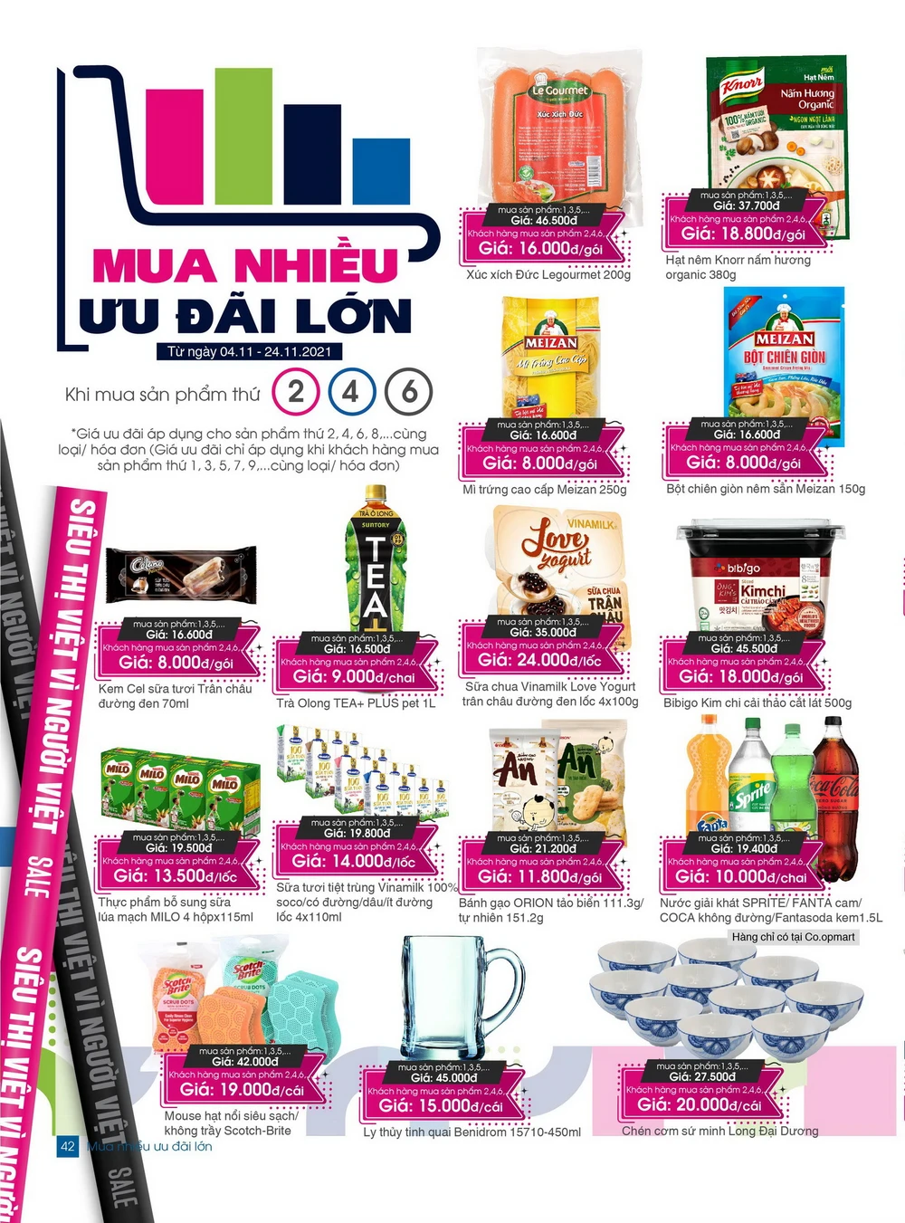 Bột chiên giòn nêm sẵn Meizan 150g còn 3.000 đồng/gói, mì trứng cao cấp Meizan 250g còn 8.000 đồng/gói, xúc xích Đức Legourmet 200g còn 16.000 đồng /gói, hạt nêm Knorr nấm hương organic 380g còn 18.800 đồng /gói. Gạo thơm ST25 Co.op Finest 5kg còn 89.000 đồng/túi, sữa chua Vinamilk Love Yogurt trân châu đường đen lốc 4x100g còn 24.000 đồng/lốc, Bibogo kim chi cải thảo cắt lát 500g còn 18.000 đồng/hộp...
