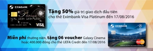 Tại các khu vực khác, chủ thẻ được tặng 100.000 đồng khi phát hành thẻ mới; tặng 300.000 đồng khi có giao dịch thanh toán từ 1 triệu đồng trở lên. Eximbank cũng triển khai chương trình tặng 50% giá trị giao dịch với thẻ Eximbank-Visa Platinum trong thời gian từ ngày 20-5 đến 17-8. Theo đó, khách hàng phát hành thẻ mới sẽ được hoàn 50% giá trị giao dịch thanh toán đầu tiên (giá trị giao dịch tối thiểu phải từ 300.000 đồng trở lên). Khách hàng hiện hữu cũng được hưởng ưu đãi từ chương trình này.