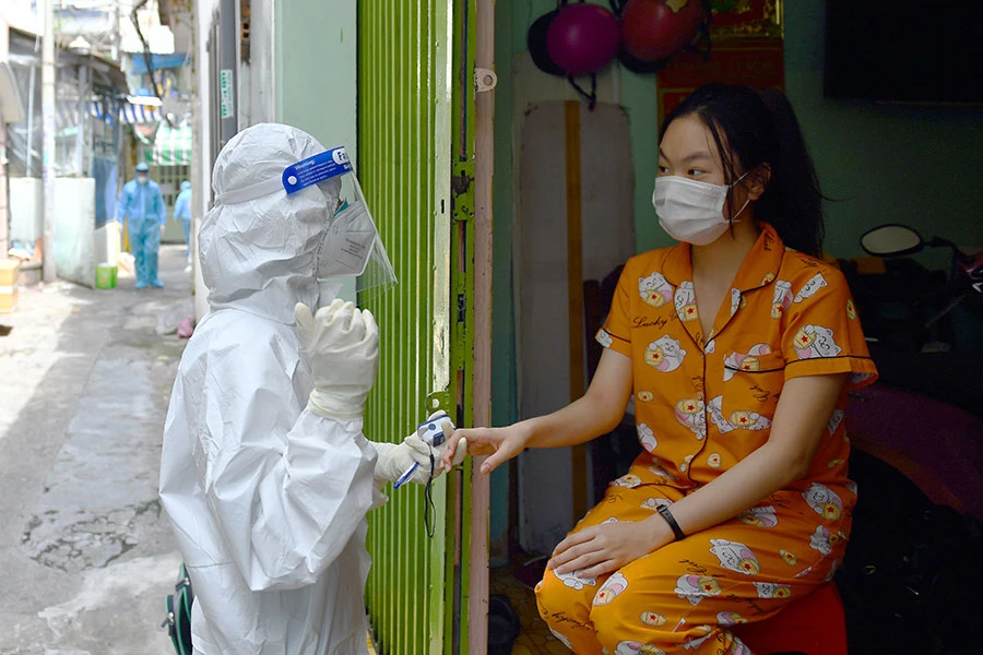 Nhân viên y tế kiểm tra sức khỏe cho FO điều trị tại nhà ở quận Phú Nhuận, TP.HCM. Ảnh: HOÀNG GIANG