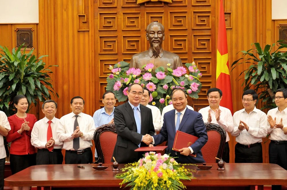 Thủ tướng Nguyễn Xuân Phúc và Chủ tịch UB Trung ương MTTQ Việt Nam Nguyễn Thiện Nhân ký kết Nghị quyết liên tịch chiều 3-10. Ảnh: HOÀNG ANH