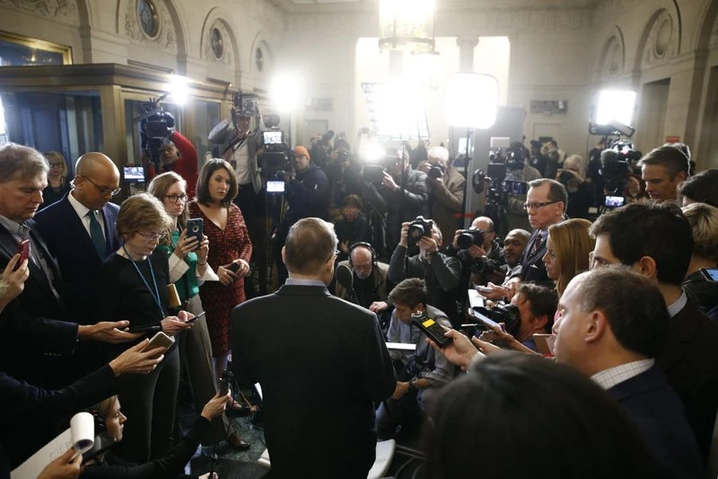 Chủ tịch Ủy ban Tư pháp Hạ viện Jerry Nadler đứng trước một rừng phóng viên khi tuyên bố ủy ban của mình đã phê chuẩn hai điều khoản để luận tội Tổng thống Trump. Ảnh: AP