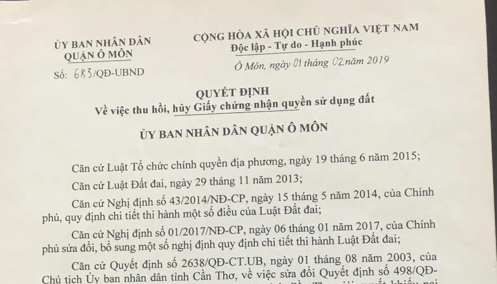 Quyết định 683/2019 của UBND quận Ô Môn về việc thu hồi giấy đỏ của chồng bà T. căn cứ theo theo Quyết định 2638/2003 trong khi Quyết định 2638 ban hành không đúng thẩm quyền theo Luật Đất đai năm 1993. Vì vậy, UBND quận Ô Môn căn cứ theo Quyết định 2638 để thu hồi giấy đỏ của chồng bà T. là không đúng. Mặt khác, người tranh chấp vời gia đình bà T. chỉ tranh chấp diện tích 2.500 m2 và Quyết định 2638 cũng chỉ công nhận người này được sử dụng 2.500 m2 nhưng UBND quận lại thu hồi toàn bộ giấy với diện tích hơn 18.800 m2 là không phù hợp…