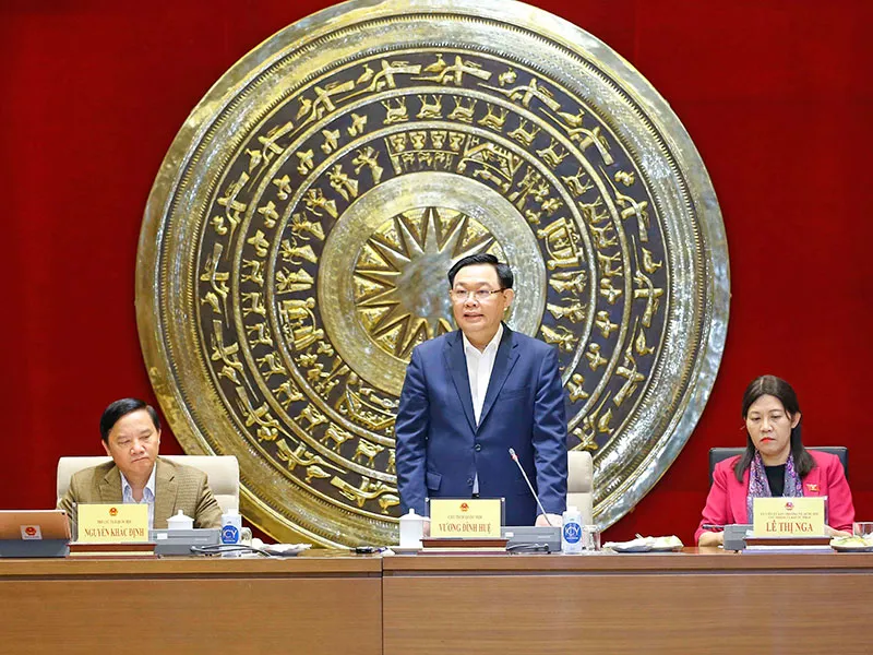 Chủ tịch Quốc hội Vương Đình Huệ phát biểu tại buổi làm việc với Ủy ban Tư pháp của Quốc hội. Ảnh: TTXVN