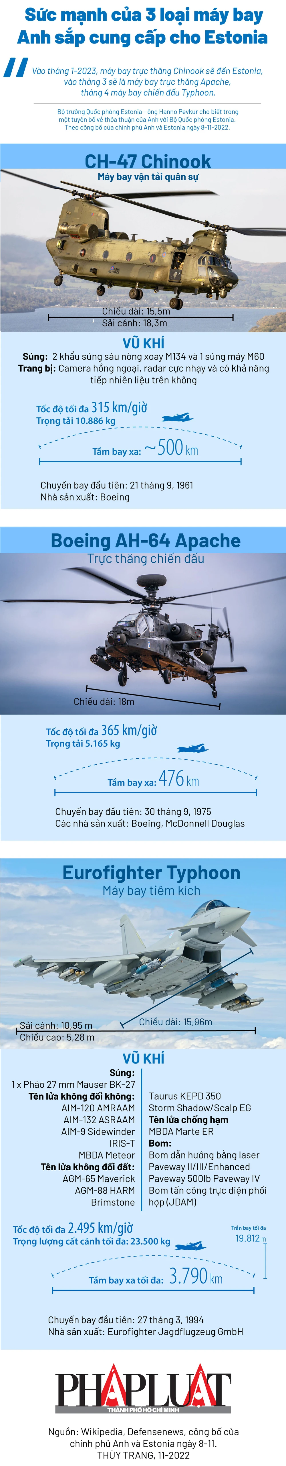 (PLO)- Thỏa thuận đã được Bộ trưởng Quốc phòng Anh Ben Wallace và Bộ trưởng Quốc phòng Estonia - ông Hanno Pevkur ký tại London. Infographic này cho thấy sức mạnh của 3 loại máy bay Anh sắp cung cấp cho Estonia vào đầu năm 2023 theo công bố của chính phủ hai nước ngày 8-11.