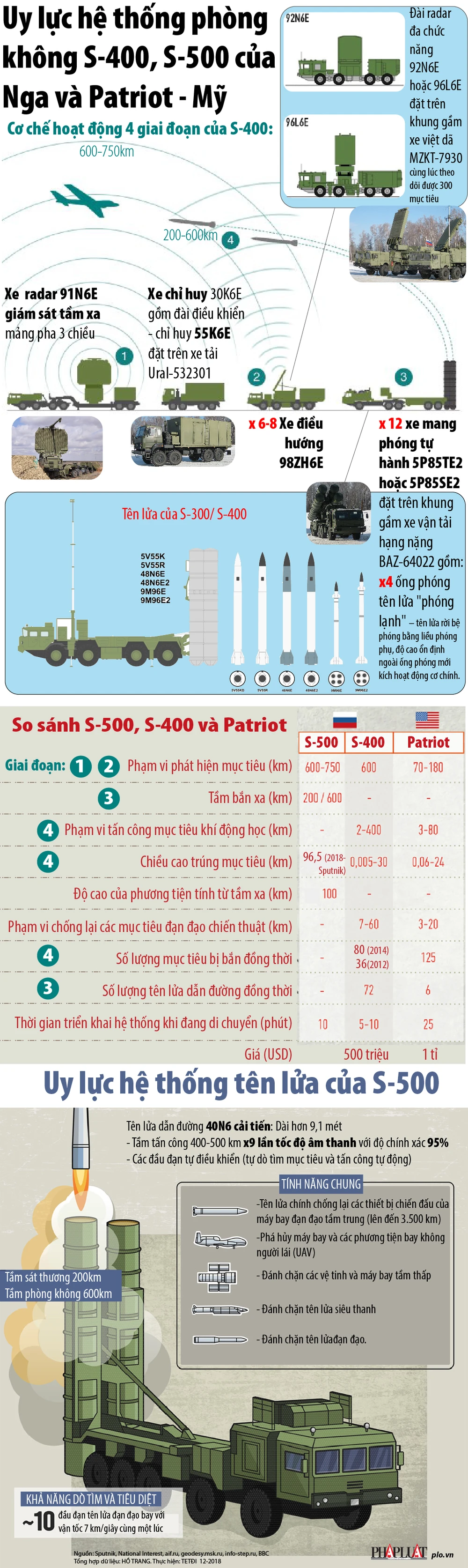 (PLO)- Hôm 24-12, phát ngôn viên của Tổng thống Thổ Nhĩ Kỳ tuyên bố việc họ mua các hệ thống tên lửa Patriot trị giá 3,5 tỉ USD của Mỹ không ảnh hưởng thỏa thuận mua các hệ thống phòng thủ tên lửa S-400 của Nga. Dưới đây là so sánh sơ nét về sức mạnh ba hệ thống phòng thủ tên lửa S-400, S-500 của Nga và Patriot - Mỹ.