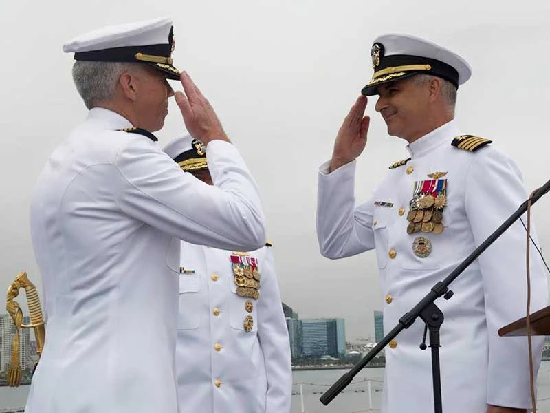 Ông Doug Verissimo (phải) được ông Karl O. Thomas chuyển giao chức vụ thuyền trưởng tàu sân bay USS Carl Vinson vào năm 2016. Ảnh: USS CARL VINSON