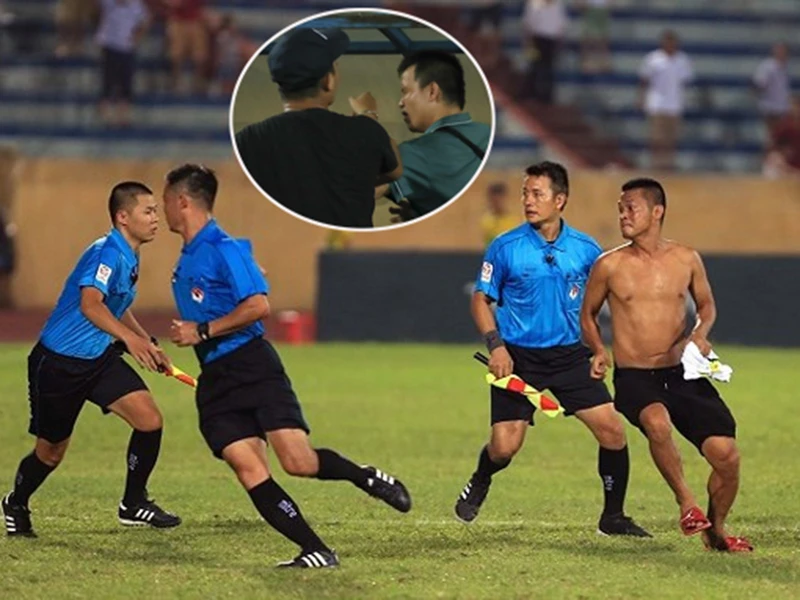 Khán giả đuổi đánh trọng tài (ảnh lớn) còn phóng viên bị nhân viên ở sân hành hung. Ảnh: CTV