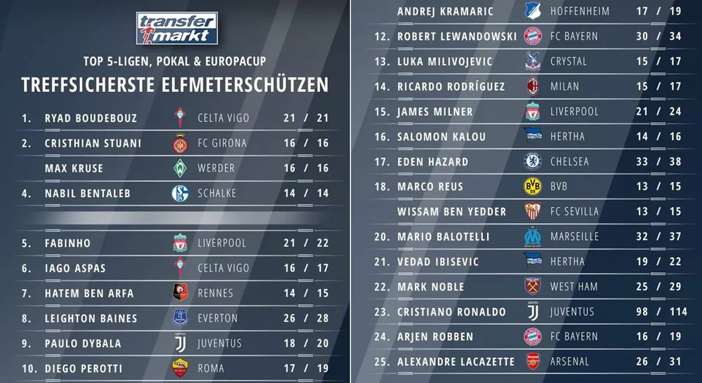 Dẫn đầu top 25 là tiền vệ tấn công Celta Vigo – Boudebouz, ghi 21 bàn thắng trên chấm 11 mét, đạt tỷ lệ 100%. Cùng với tỷ lệ này, Cristhian Stuani, Max Kruse, Nabil Bentaleb đứng sau do thực hiện số pha 11 mét ít hơn.