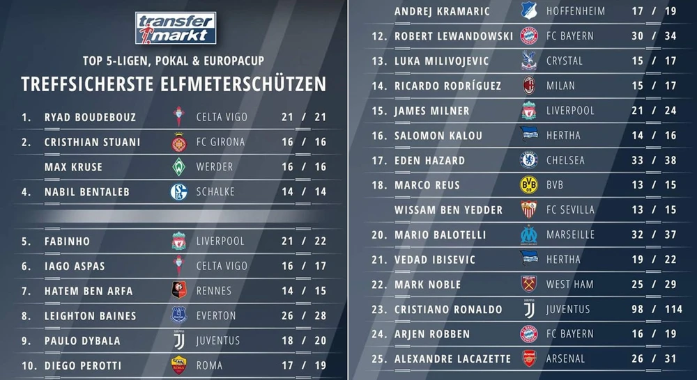 Thống kê tỷ lệ, 25 cầu thủ thành công nhất trong các pha sút 11 mét. ẢNH: Tranfersmark