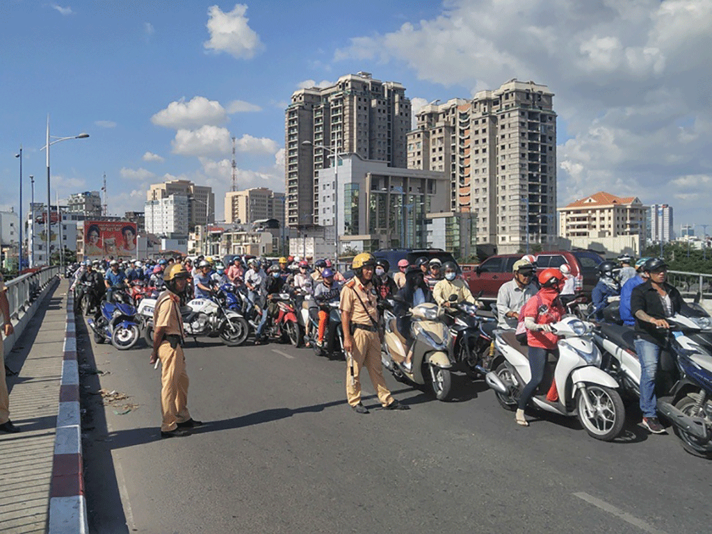 Do hiện trường vụ tai nạn nằm giữa cầu khiến tuyến đường ùn ứ nghiêm trọng, hàng ngàn phương tiện khó khăn nhích từng chút một.