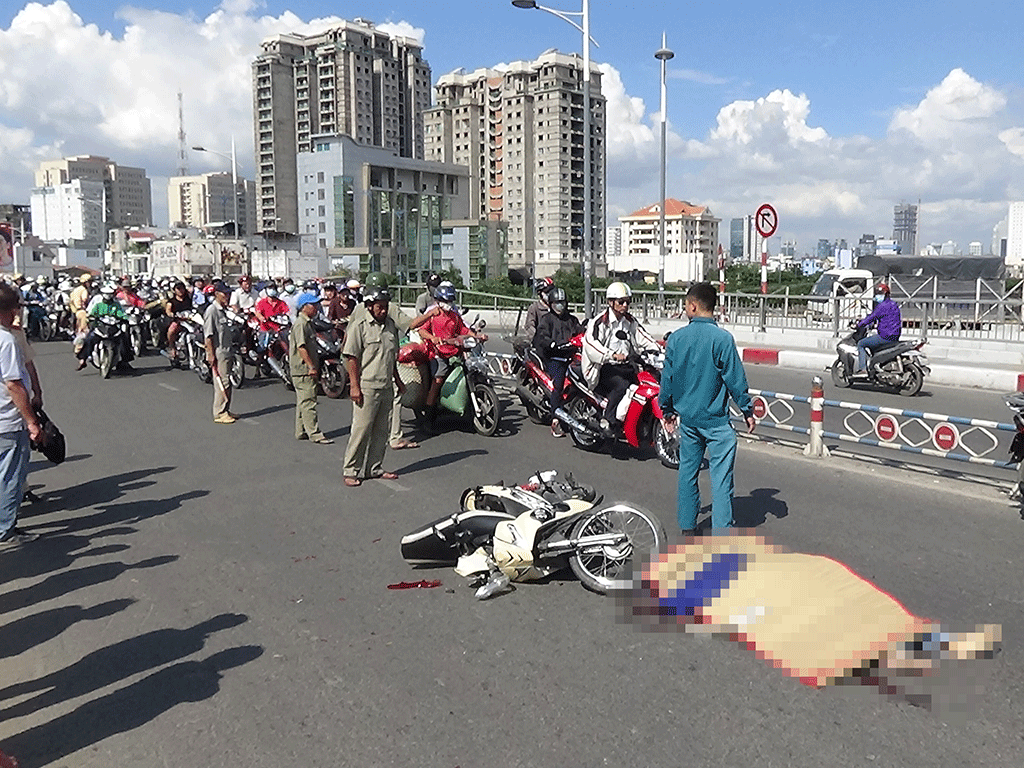 Cú va chạm khiến chiếc xe máy chao đảo và va chạm tiếp vào một ô tô bảy chỗ biển số 51F… rồi ngã ra đường.