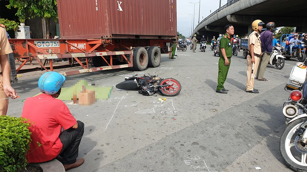 Tại hiện trường, thi thể người phụ nữ nằm cạnh chiếc xe máy bị tông hư hỏng nhẹ; chiếc nón bảo hiểm bị cán nát vụn dưới bánh container.