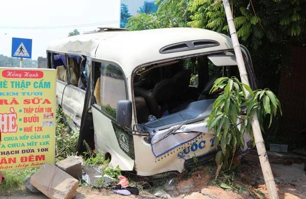 Sau cú va chạm mạnh, xe khách mất lái đâm vào một quán nước ven đường, bị biến dạng, hư hỏng nặng. Thời điểm xảy ra vụ việc có 24 người ngồi trên xe khách bị thương và phải nhập viện điều trị.