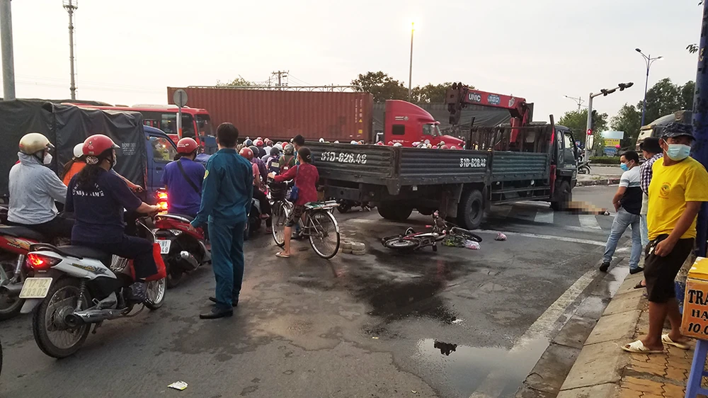 Ghi nhận, thi thể người phụ nữ nằm trước đầu xe tải cẩu, xe đạp điện nằm phía sau đuôi xe, hư hỏng. Ảnh hưởng từ tai nạn khiến giao thông qua khu vực ùn ứ.