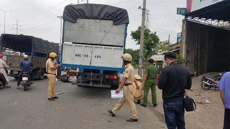 Tại hiện trường, chiếc xe máy nằm gần bánh sau xe tải, hư hỏng nhẹ.
